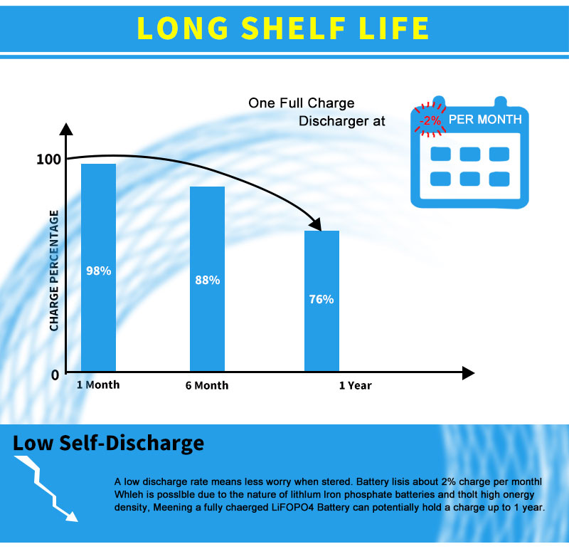Մենք առաջարկում ենք 2 տարվա երաշխիք մեր մարտկոցների ամբողջ փաթեթի համար: մենք ապահովում ենք առնվազն 2000 ցիկլի կյանք LiFePO4 մարտկոցի տուփի համար, ինչը նշանակում է, որ 2000 @ 80% DOD- ից հետո դեռ կմնա մոտ 60% հզորություն: Դուք կարող եք այն օգտագործել առնվազն 5 տարի սովորական 1 անգամ լիցքավորման և լիցքաթափման համար ամեն օր: