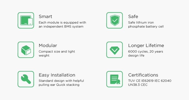 Հավաստագրման և անվտանգության ստանդարտ | Հավատարմագրված է TUV / CE / EN62619 / IEC62040 / UN38.3 / CEC | |