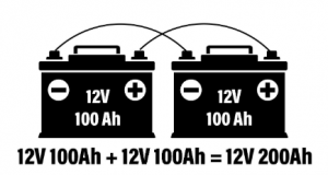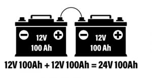 Ստորև բերված պատկերում կա երկու 12 վ մարտկոցներ միացված շարքով, որն այս մարտկոցի բանկը վերածում է 24V համակարգի: Կարող եք նաև տեսնել, որ բանկը դեռ ունի ընդհանուր հզորության վարկանիշ ՝ 100 Ահ:
